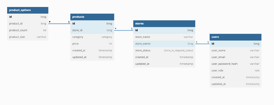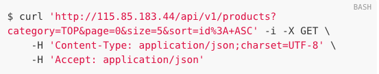 이해를 돕기 위해 ERD도 첨부했습니다. 물품 목록 조회 API는 Product의 Category를 쿼리 파라미터로 받아 Product Option과 함께 반환해주는 기능입니다. Spring Rest Doc을 통해 생성된 문서를 보면 다음과 같이 요청을 보냅니다.