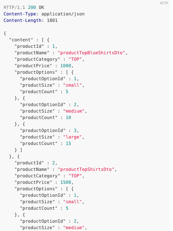 상품과 함께 사이즈에 따른 수량도 함께 나오는 것이 기획이었기 때문에 Index, N + 1 문제 등 테스트 하기도 전에 걱정되는 API 입니다. 그럼 테스트 결과를 한번 보겠습니다!