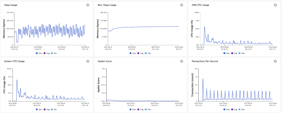 원인을 알아야 하니 Inspector를 통해 어플리케이션 서버 상태 또한 기록해놓았습니다. Heap Usage도 마이너 GC가 지속적으로 잘 일어나고 CPU Usage를 확인해보았을 때도 어플리케이션 서버가 병목 지점은 아닐 가능성이 높아 보입니다.