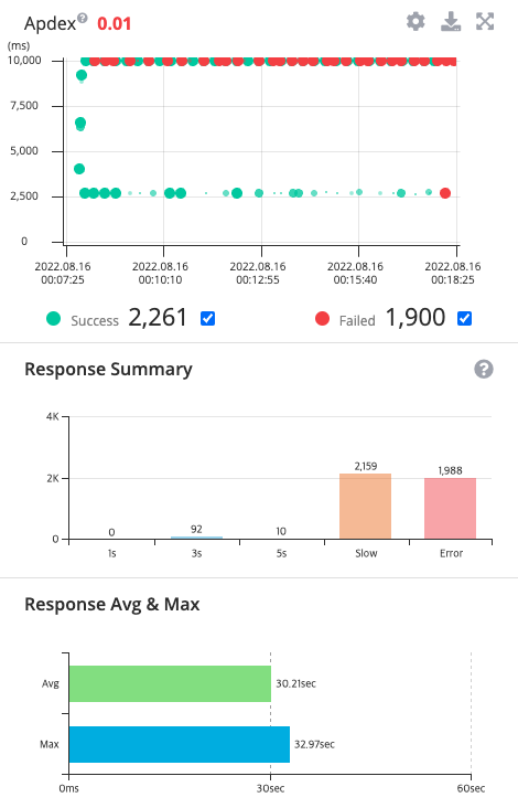 테스트 결과를 보고 인프라 개선전 과거에서 테스트했나라는 착각을 했습니다... 다시 마음을 추스리고 원인을 파악하기 위해 Pinpoint를 확인했습니다. 예상을 하나도 벗어나지 못했습니다. 1초 이내로 반환되는 응답은 하나도 없었으며 최대 32초 이상까지 응답이 지연되는 것을 볼 수 있습니다.