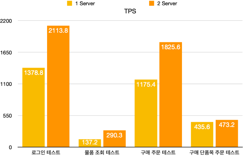 먼저 Session Management를 도입하므로써 단일 서버의 성능은 이전보다 떨어져 한 개의 Server 성능 * N(Scale-Out Server 개수) 보다 성능이 안 좋게 나오는 것을 확인할 수 있었습니다. 그리고 물품 조회 테스트, 구매 단품목 주문 테스트의 경우 성능이 향상되기는 하지만 목표 기준(1250 TPS)에는 한참 못 미치는 성능을 보이고 특히 구매 단품목 주문 테스트의 경우 8% 정도밖에 향상이 되지 않습니다.