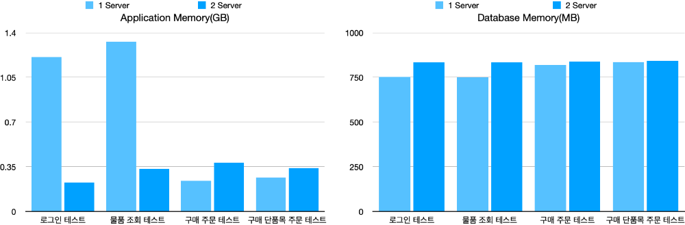 메모리 사용량은 Application Server의 경우 Heap 메모리를 기준으로 모니터링을 진행했습니다. 하지만 GC 수행 여부에 따라서 메모리 사용량이 달라 의미있는 비교 지표를 나타내지 못한다고 판단했습니다. Database의 경우는 전반적으로 상승은 있었으나 유의미한 차이를 보이지 않아 큰 소득이 없었습니다. 다만 아직 메모리로 인해 문제가 나타나는 영역에는 다다르지 못했다는 확인은 할 수 있었습니다.