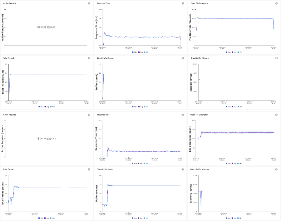 Response Time은 Distributed Lock이 짧고 특히 Total Thread와 Tomcat의 Connection과 관련된(Socket 동작) Direct Buffer Count의 경우 Distributed Lock을 사용하는 곳에서 더 적은 것을 확인할 수 있었습니다.