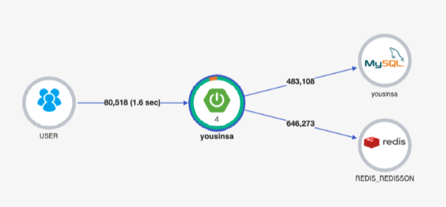 데이터베이스 노드 모니터링 결과를 보면 차이가 없는 것을 확인할 수 있습니다. 따라서 분산락을 사용해도 DB의 Busy IO Wait가 비슷한 비율로 수행됩니다. 그렇다면 다시 원래 질문으로 돌아가기 위한 Pinpoint 지표를 살펴보겠습니다.