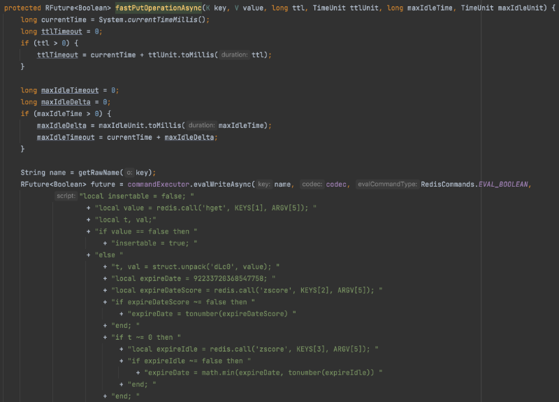 위 코드와 같이 Map이라는 자료 구조에서 지원하지 않는 TTL 기능을 구현한 것을 볼 수 있습니다. `evalWriteAsync` 메서드 마지막에 script라고 표시된 부분을 보면 Code인 듯 보이는 문자열로 if, then 등 예약어들을 볼 수 있습니다. 이 Script를 Lua Script라고 말하며 프로그래밍적인 문법과 더불어 하나의 Script는 Atomic 하다는 것을 보장해줍니다.
