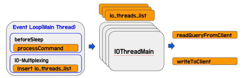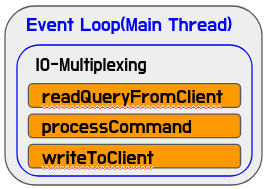 Event Loop에서 IO Multiplexing을 이용해서 Read/Write 이벤트를 받아오고, Read 이벤트가 발생하면 네트워크를 통해 패킷을 읽고, Command가 완성되면 실행되는 구조입니다.