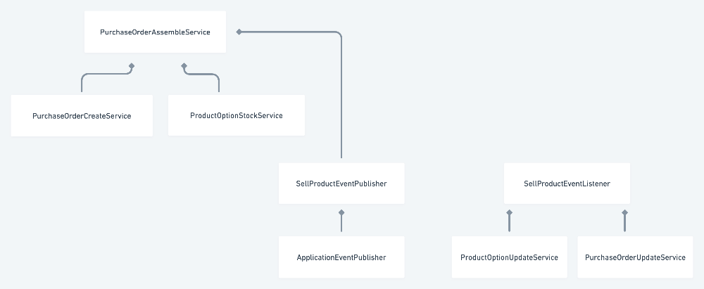 Spring Event Publisher를 사용했을 때의 Class Diagram을 구상해보았습니다. 이전의 구조와는 다르게 재고 수량을 업데이트하는 Service는 구매 주문을 요청 시 필요 없으므로 관계가 필요 없게 됩니다. 상위 Service Layer인 PurchaseOrderAssembleService는 구매 주문서를 작성하는 것과 Cache Layer에서 재고를 관리하는 Service와 Event Publisher를 Composition 관계로 연결되어 있습니다.
