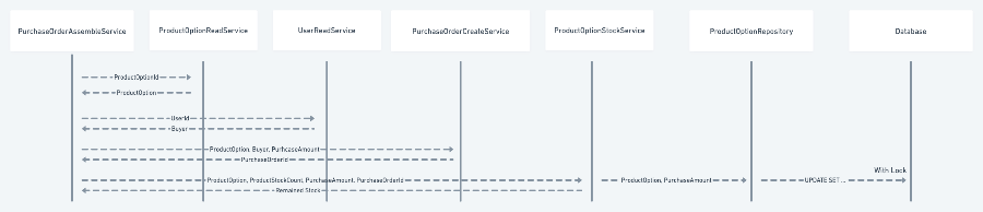 현재 구매 주문 과정을 Sequence Diagram으로 표현해본다면 다음과 같을 것입니다.